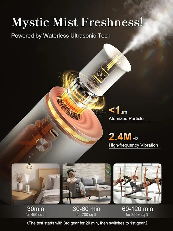 Mystic Mist Freshness! Powered by Waterless Ultrasonic Tech Long Lasting Forever Uncloggable, exceptionally durable SFAS (Super High Frequency Atomization System) No Water Required Quiet Design Diffuser Spread 500m3...